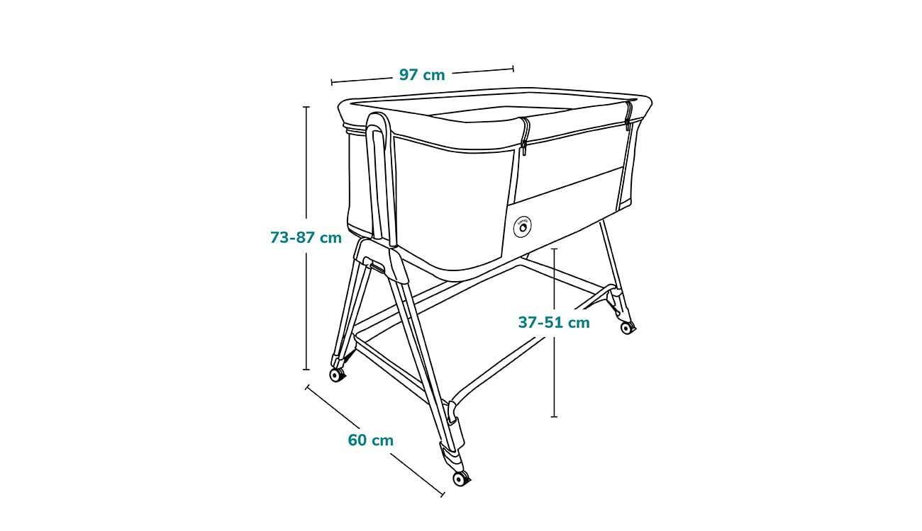 Зовнішні розміри: приблизно 90 × 52 × 80 см Розмір спального місця: близько 83 × 50 см Регулювання висоти спального рівня: від 32 до 44 см Вага ліжечка: близько 7 кг Максимальне навантаження: до 9 кг