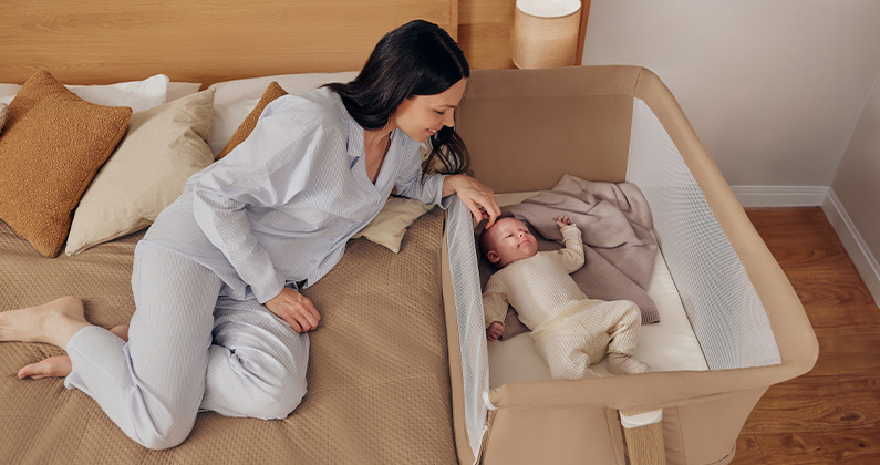 Приставне ліжко — бокову панель можна легко відстебнути, а ремені забезпечують міцне кріплення до батьківського ліжка.