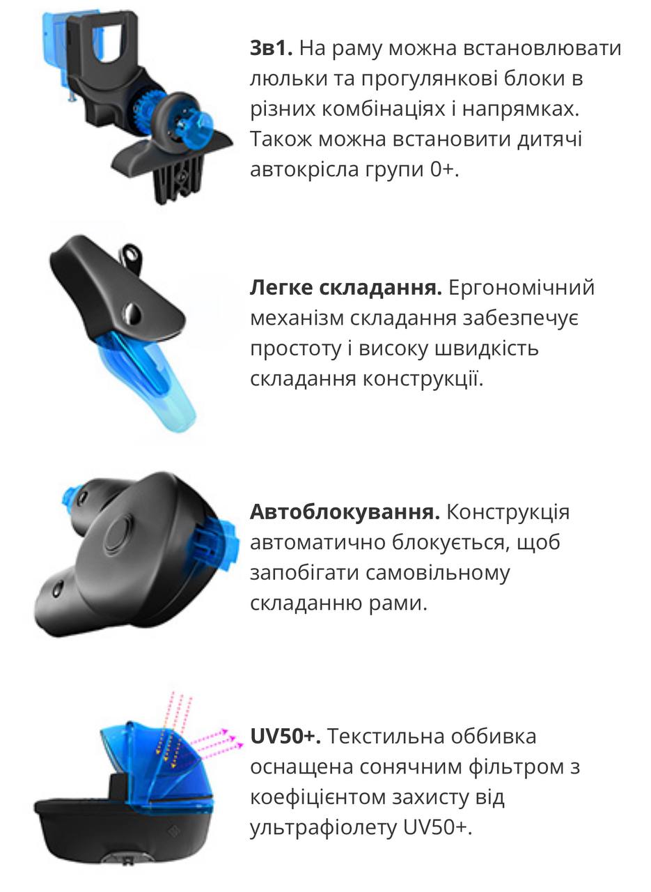 Регульований капюшон з вентиляційною панеллю захищає від погодних умов. Люлька має вбудовану під капюшоном москітну сітку. Оббивка з фільтром ультрафіолету UV50+ допомагає захистися від негативного впливу сонячних променів.
