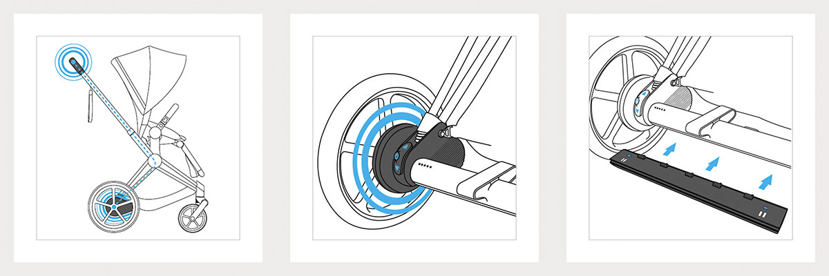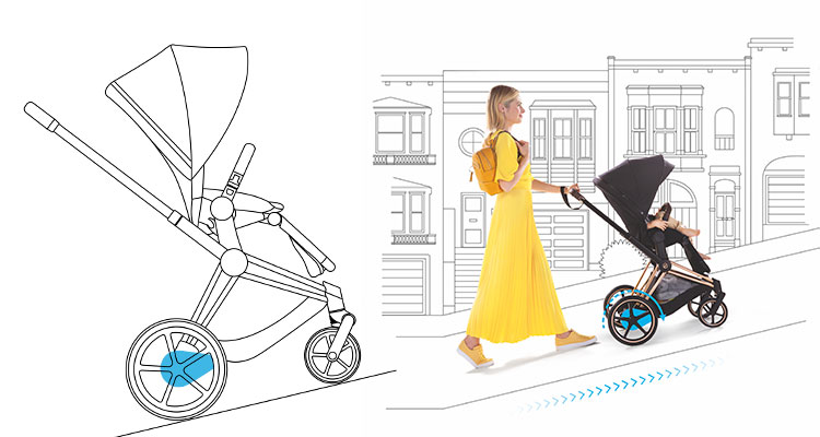 Подорожуйте вниз по схилах з комфортом за допомогою e-Priam - визначаючи тиску на батьківську ручку, коляска уповільнює спуск.
