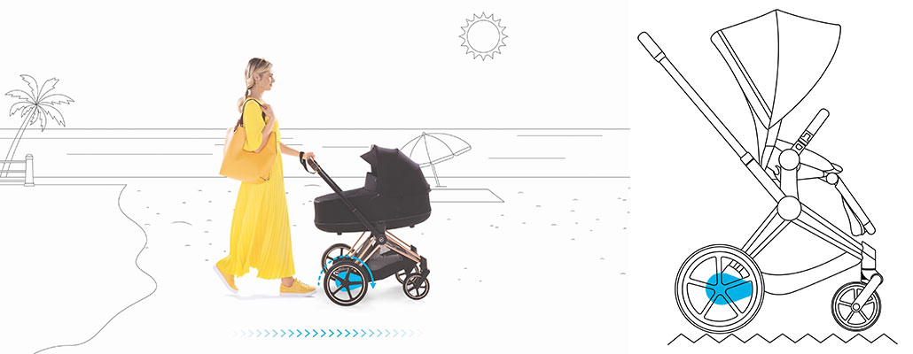 З e-Priam по бездоріжжю, коляска дозволяє вам проїхати по піщаним пляжам, дороги з бруківки і снігові зимові вулиці.