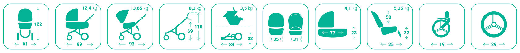 Розміри в розкладеному вигляді: 99х61х122 см Розміри в складеному вигляді: 84х61х32 см (рама з колесами) Висота ручки: 110-69 см Довжина підставки для ніг: 22 см Висота спинки: 50 см Глибина сидіння: 25 см Люлька: 77х23 см Вага коляски: 13.65 кг Вага люльки: 4.1 кг Вага рами з колесами: 8.3 кг Вага: 12.4 кг