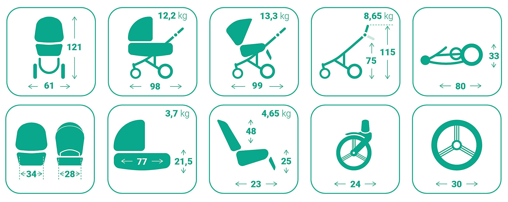 Розміри в розкладеному вигляді: 98х61х121 см Розміри в складеному вигляді: 80х61х33 см (рама з колесами) Висота ручки: 75-115 см Довжина підставки для ніг: 25 см Висота спинки: 48 см Глибина сидіння: 23 см Люлька: Довжина 77см, Ширина 34 см, глибина 21.5 см Вага коляски: 12.2 кг Вага люльки: 3.7 кг Вага рами з колесами: 8.65 кг