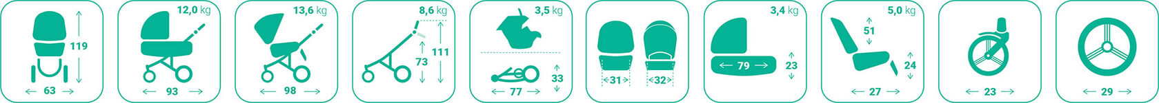 Розміри в розкладеному вигляді: 93х63х119 см Розміри в складеному вигляді: 77х63х33 см Висота ручки: 73-111 см Довжина підставки для ніг: 24 см Висота спинки: 51 см Глибина сидіння: 27 см Люлька: 79х32х23 см Вага коляски: 13.6 кг Вага люльки: 3.4 кг Вага рами з колесами: 8.6 кг